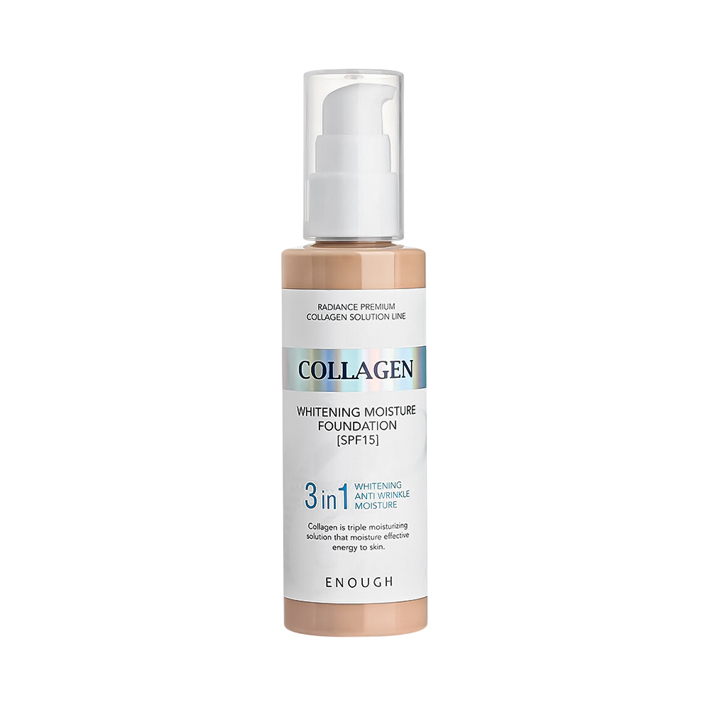 Тональный крем с коллагеном Enough Collagen Whitening Moisture Foundation SPF15 создаёт плотное покрытие и скрывает несовершенства, равномерно распределяется по коже и обладает высокой стойкостью, дарит здоровое сияние. Физические солнцезащитные фильтры защищает от агрессивного воздействия ультрафиолета и фотостарения, предотвращает образование пигментации. Замедляет процесс старения, поддерживает упругость и эластичность кожи. Основные действующие компоненты: