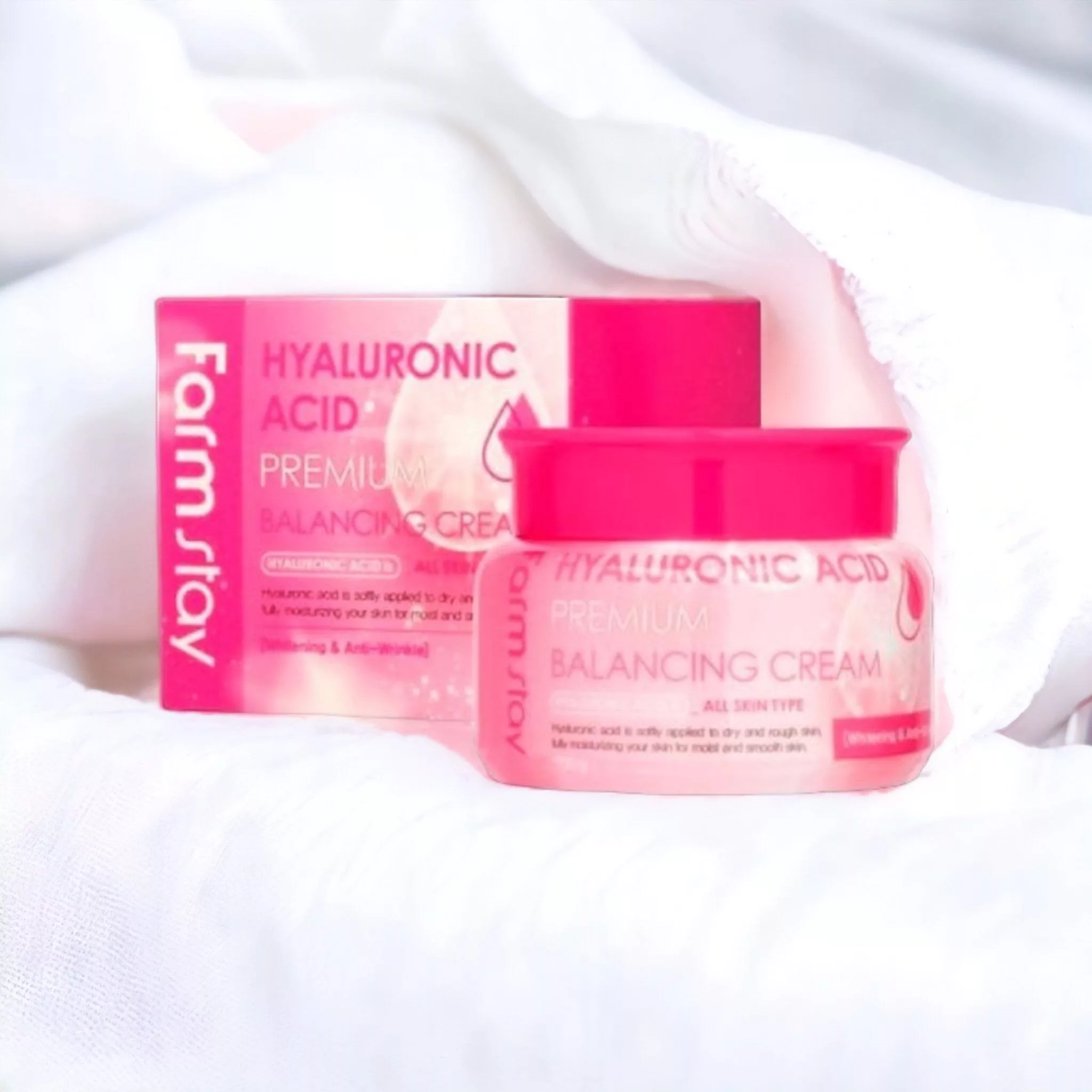 FarmStay Hyaluronic Acid Premium Balancing Cream – балансирующий крем для лица с гиалуроновой кислотой. Обеспечивает интенсивное увлажнение и улучшение текстуры кожи, придавая ей здоровый и сияющий вид. Подходит для всех типов кожи.