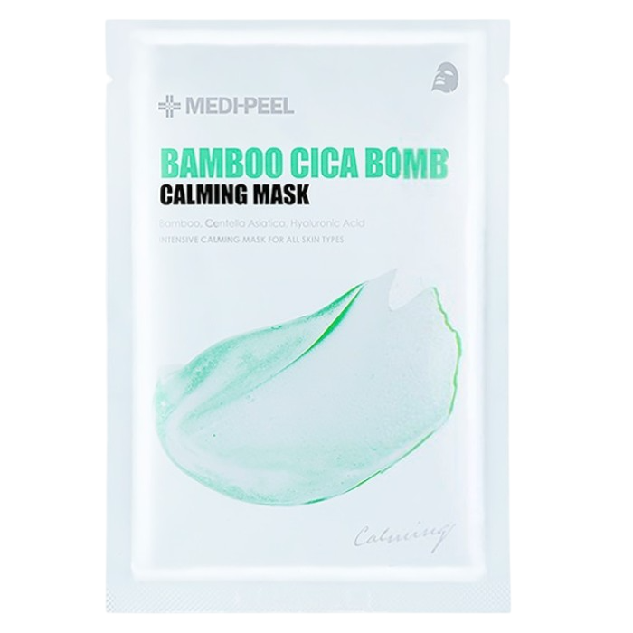 Успокаивающая тканевая маска с центеллой и бамбуком MEDIPEEL Bamboo Cica Bomb Calming Mask обладает сильным антибактериальным и противовоспалительным действием, быстро снимает раздражения, уменьшает покраснения, борется с куперозом. Предотвращает появление новых воспалений, эффективна в комплексном лечении акне и угревой сыпи. Мягко отшелушивает омертвевшие клетки, осветляет пигментацию и следы пост-акне. Средство помогает контролировать выработку кожного себума и матирует кожу, а также прекрасно тонизирует, увлажняет и питает. Способствует удержанию влаги внутри клеток и предотвращает обезвоживание. Маска стимулирует выработку коллагена и способствует омоложению кожного покрова, устраняет дряблость кожи, разглаживает ее и борется с возникновением морщин, уменьшает их глубину. Оказывает дренажный эффект и борется с возникновением отёчности. Средство запускает процессы регенерации внутри клеток, способствует выведению токсинов, повышает иммунитет и улучшает барьерные функции кожи, способствует ее защите от влияния негативных факторов окружающей среды. Активные ингредиенты: