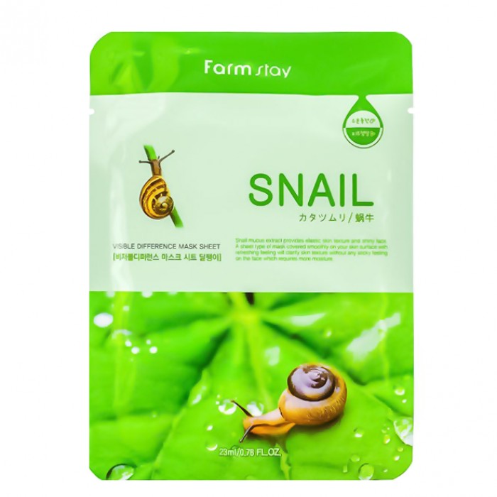 Питательная тканевая маска для лица с высоким содержанием улиточного муцина FarmStay Visible Difference Mask Sheet Snail подарит коже упругость и эластичность, защитит от преждевременного старения, подтянет и увлажнит, оказывает противовоспалительное и антибактериальное действие и убирает отёчность. Улиточный экстракт запускает процессы восстановления кожи на клеточном уровне, а также улучшает внешнее состояние: устраняет шелушения, способствует заживлению воспалений, рассасывает пятна пост-акне. Экстракт слизи улитки поддерживает эластичность и тонус кожи, оказывает регенерирующее действие, увлажняет и питает, способствует отшелушиванию ороговевшего слоя, оказывает противовоспалительное действие, защищает от свободных радикалов и преждевременного старения, а также от воздействия вредных микроорганизмов. Средство поможет быстро вернуть коже шелковистость, подготовит к нанесению макияжа, защитит от негативного воздействия внешней среды. Применение: Нанести маску на очищенную кожу, подержать 15-20 минут, после чего снять и вмассировать остатки эссенции в кожу.